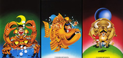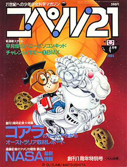 公文式の科学雑誌「コペル21」(くもん出版)のカバー用キャラクター。発行してから2年目の1年間、表紙の依頼を受け12星座のメカをカバーイラストに描くことに。 そこに星座メカを作る犬のロボット博士を毎号一緒に登場させた。コペルトゥエンティ”ワン”……ワンってくれば犬っちゅーことでバッチリね!1年間ですっかり読者の子供達の評判となり、トエニーワンという愛称までつけてもらいました。キャラクターってユーザーとのコミュニケーションがより広がるものだ、と実感させられたキャラクターでした! |