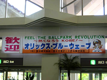 気温22度快晴の空と共に、宮古島空港で「歓迎オリックス・ブルーウェーブ」の垂れ幕が出迎えてくれた。