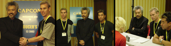 <写真左・中>今回のCAPCOM社発表作品の内、米国所在の開発会社「CAPCOM STUDIO8」で開発された作品は『MAXIMO vs ARMY of ZIN 』のみ。CAPCOM STUDIO8の開発プロデューサーMARK ROGERSは前作からのお付き合いとあって、呼吸はピタリといったところ。<写真右>今回は、米国内、外(主に日本)から数多くの取材陣が駆けつけた。E3 Expoの前々日に行われた「CAPCOM PRODUCER's DAY」において取材を受ける松下進とCAPCOM STUDIO8 |