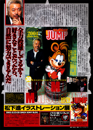 キャラクターの名前は"Mac Bear"。松下進は回想する。当時、「西海岸ブーム」というのがあった。夢のカルフォルニア。このカルフォルニア州のシンボルマークが熊だった。それから、ちょうどモスクワ五輪の前で、そのマスコットキャラクターも熊だったから熊にしたんだ・・・。なんとも簡単な成り立ちだが、この"Mac Bear"が松下進が作り出した最初のオリジナルキャラクターとなったのである。それから、現在まで数え切れない数のキャラクターを産み出していった松下進。ヤングジャンプがあったから、今の活動があったと言っても過言ではない。それにしても、なんで名前が"Mac Bear"なんだろう。当時の松下進は、きっとこんな風に答えたんだろう。「さぁね、逆立ちしたら、思いついたんだよ」